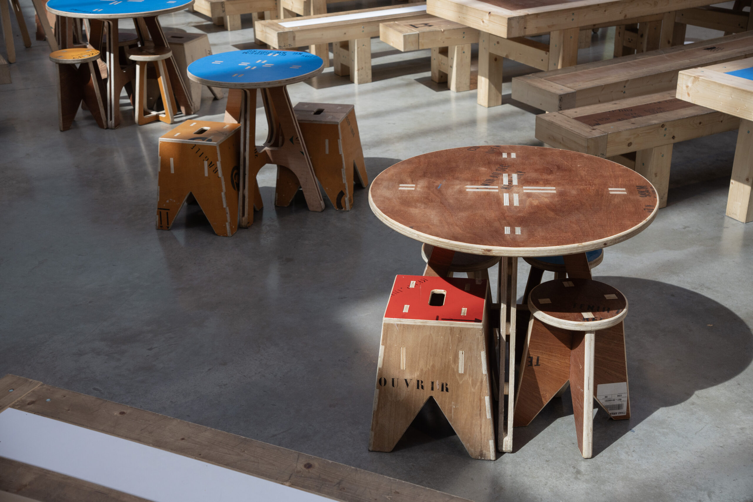 Plus de 750 pièces : chaises, tables, tabourets, luminaires ont été fabriqués à Saint-Ouen dans les ateliers de KOZTO avec une ressource recyclée à 90%.