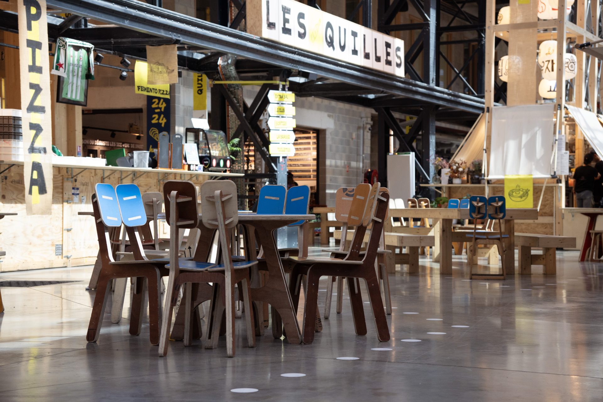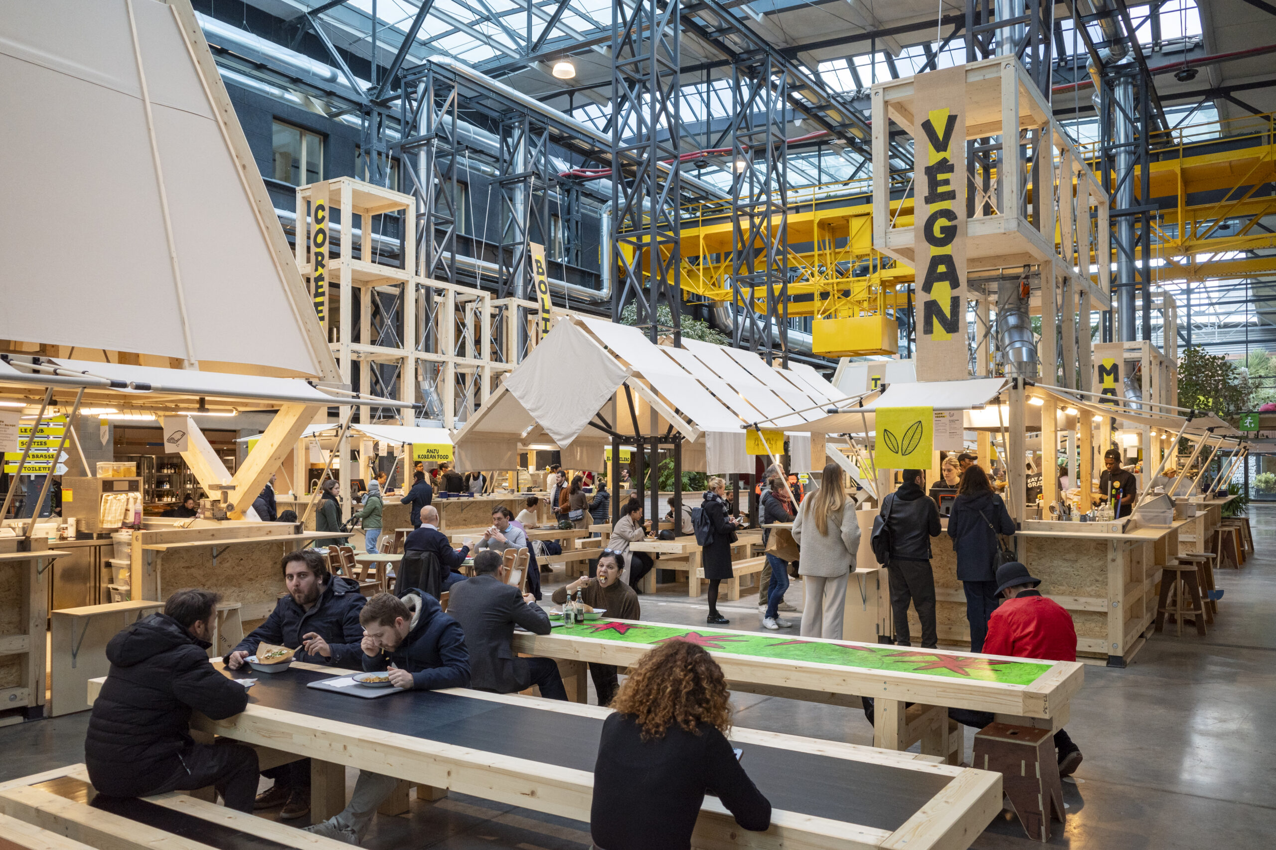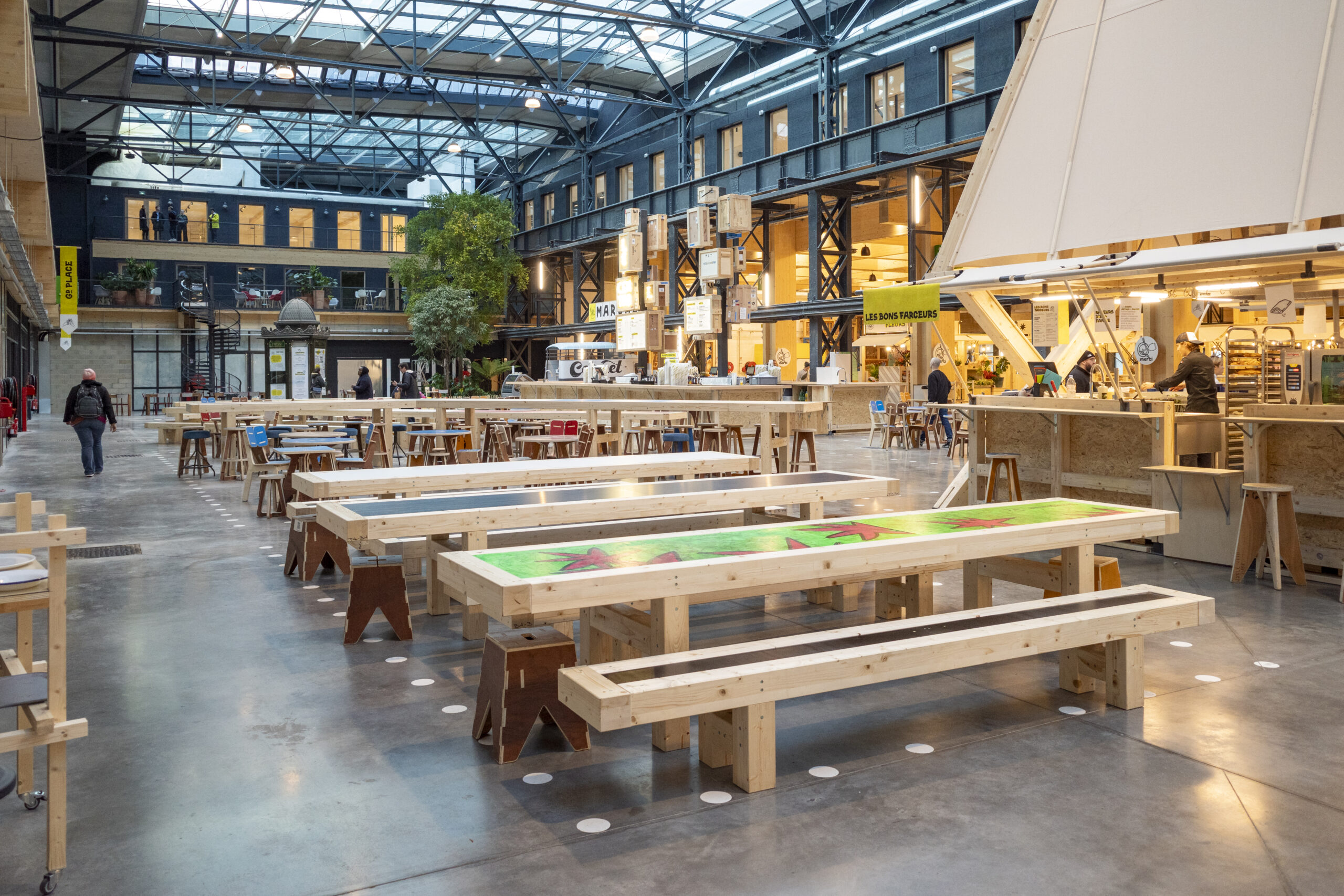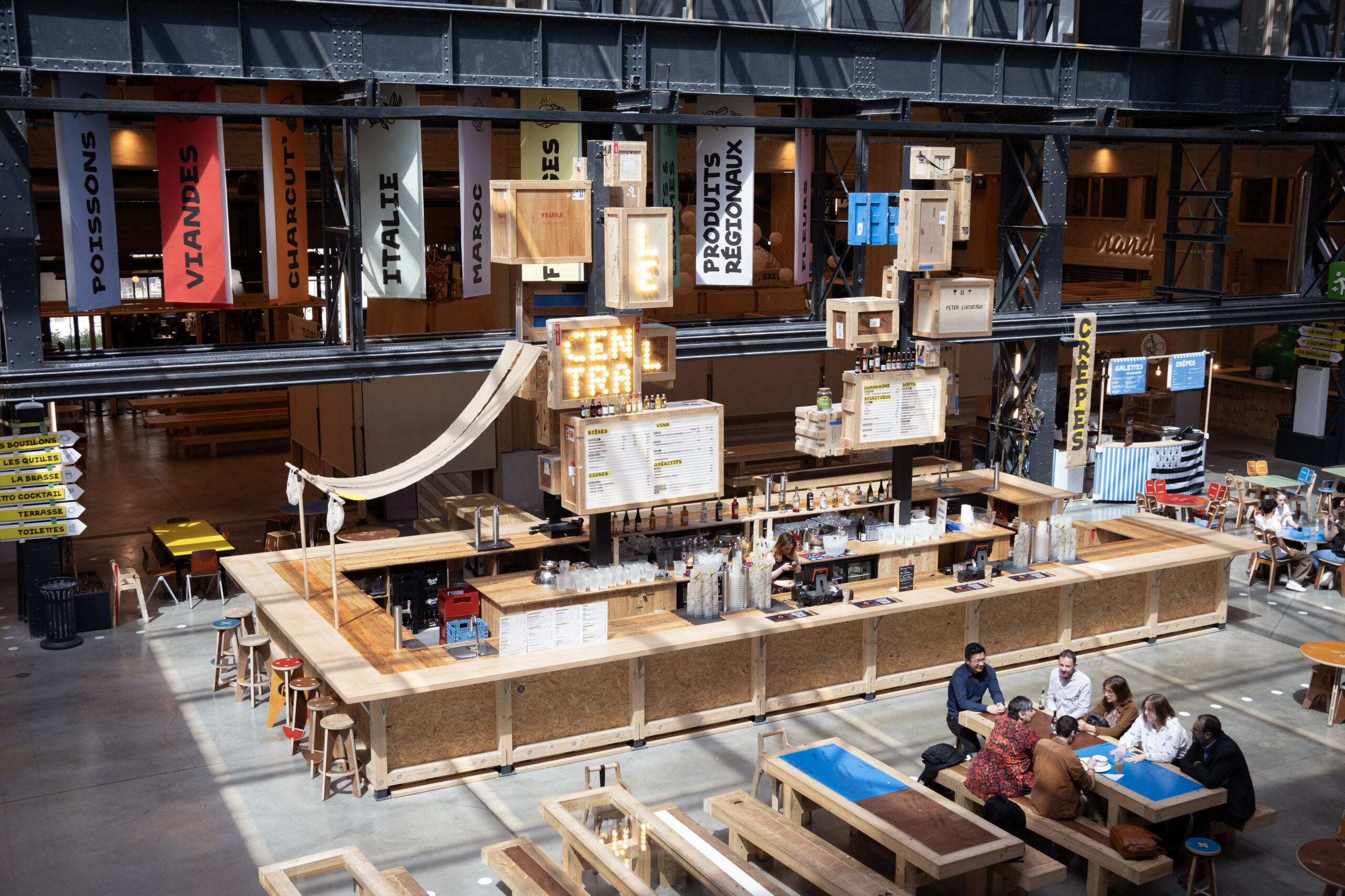 La signalétique peinte en lettre sur place, les toiles des kiosques cousues dans la halle, les petits éléments de décoration ont été fabriqués à la main avec des objets détournés recyclés ou chinés.