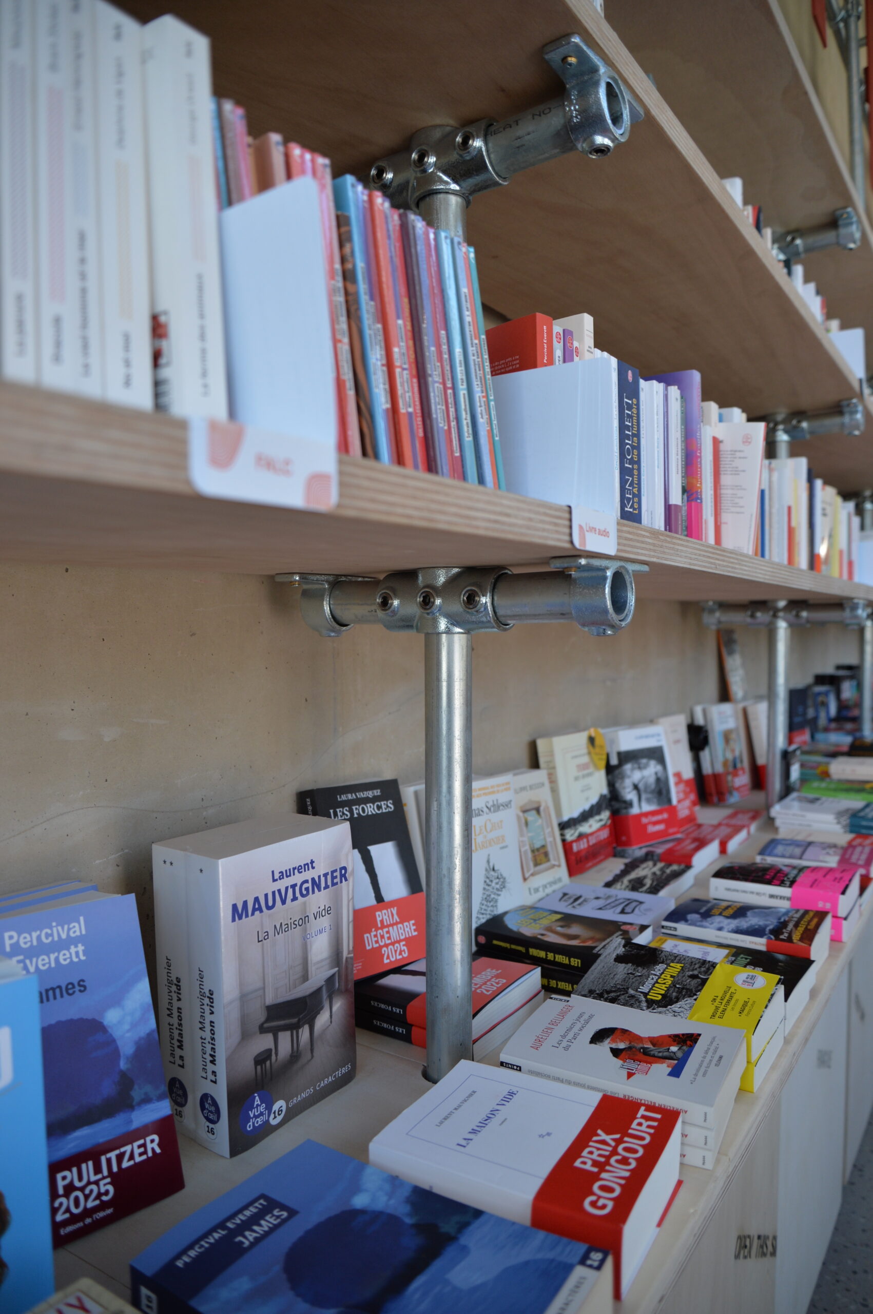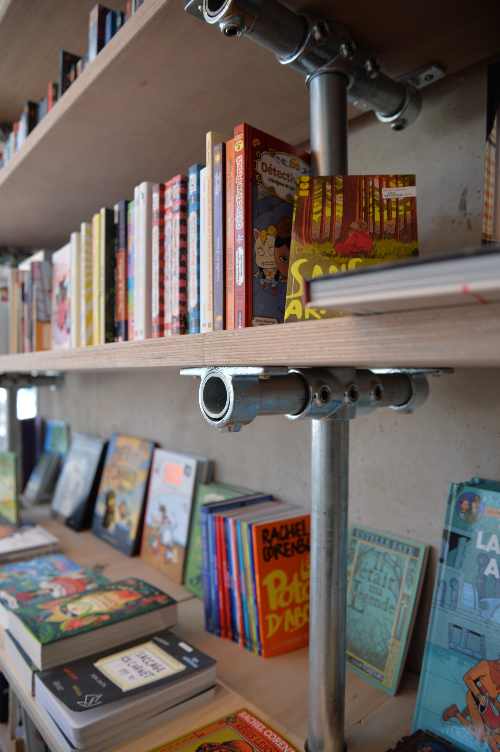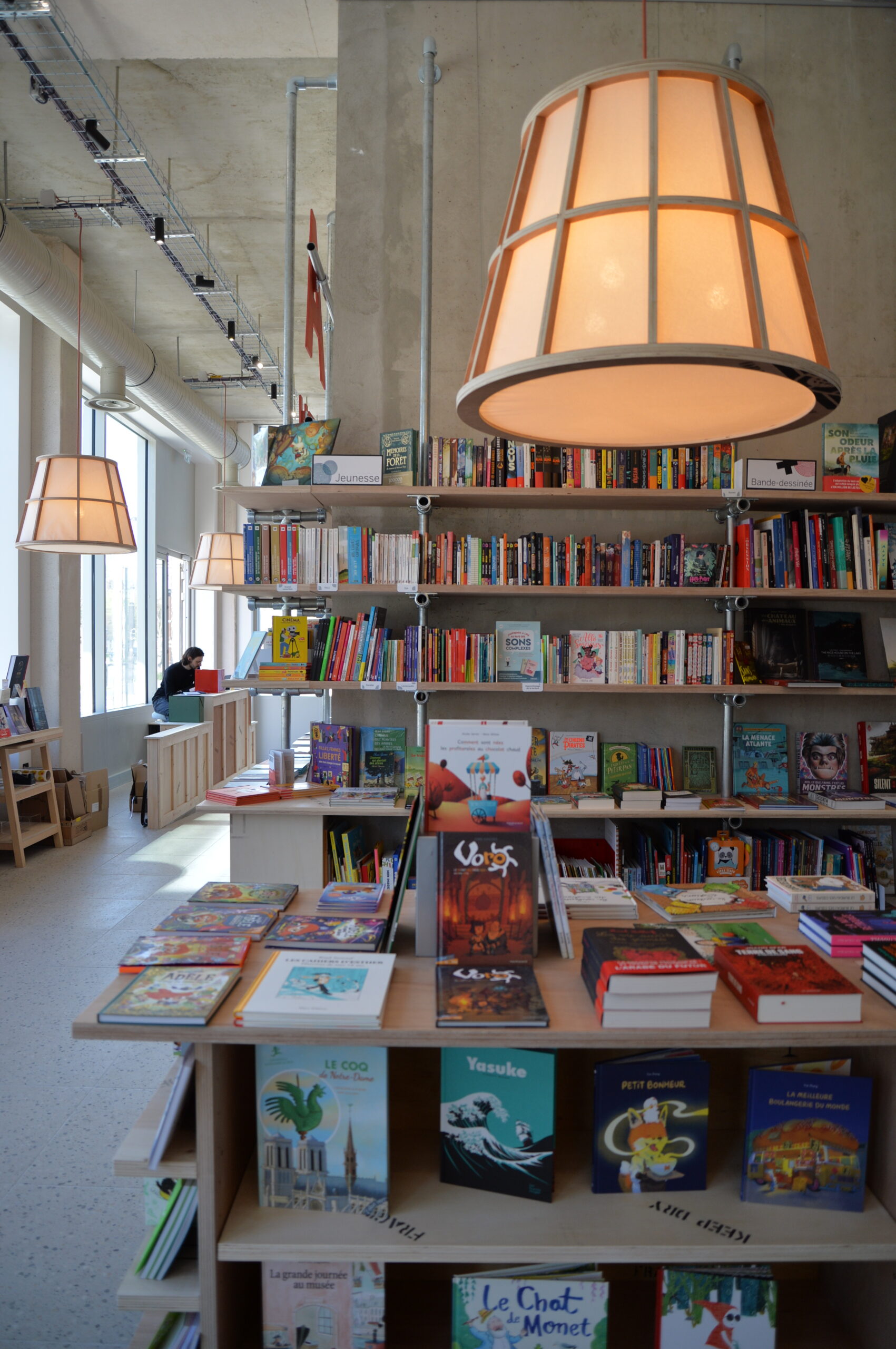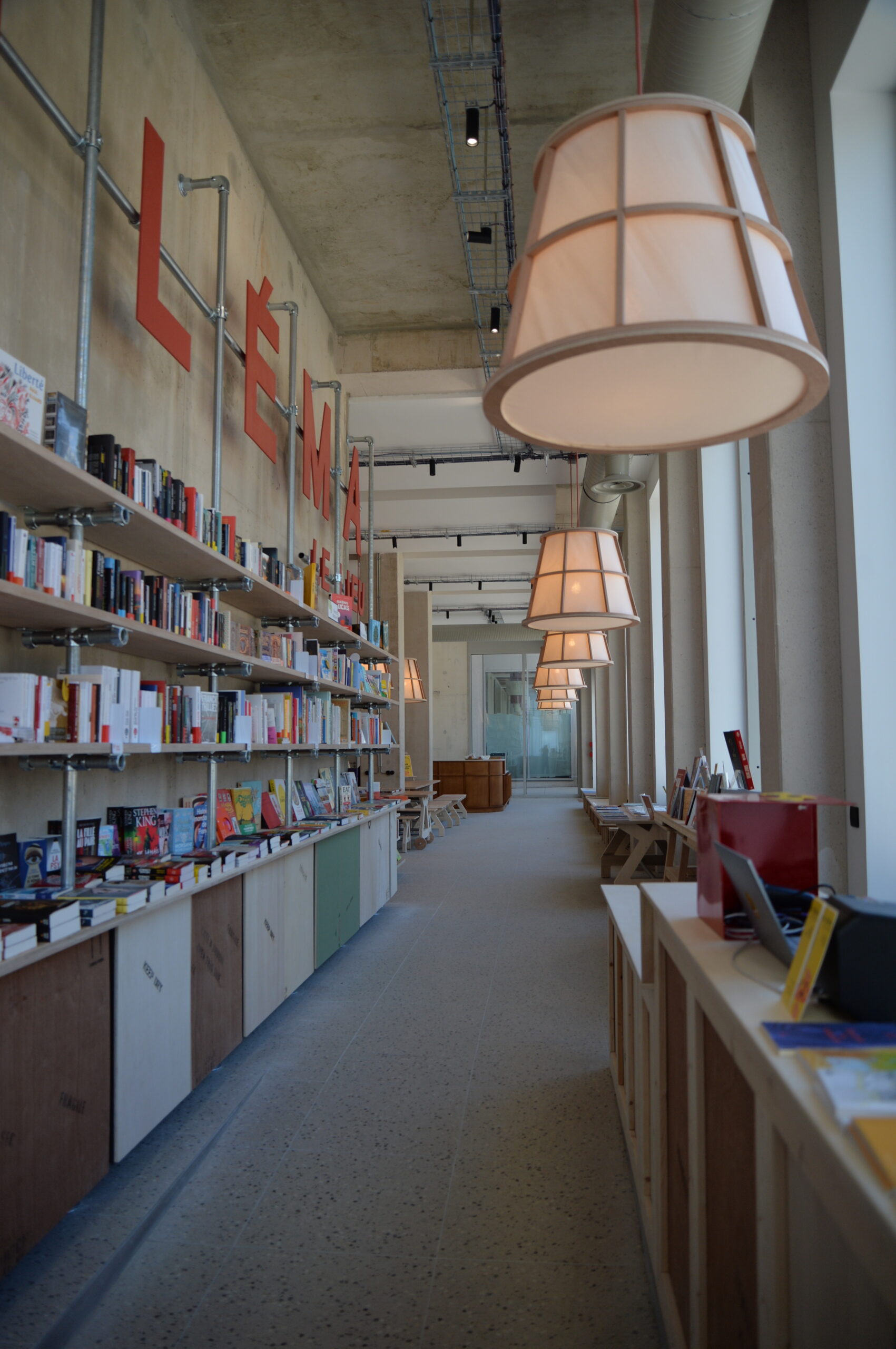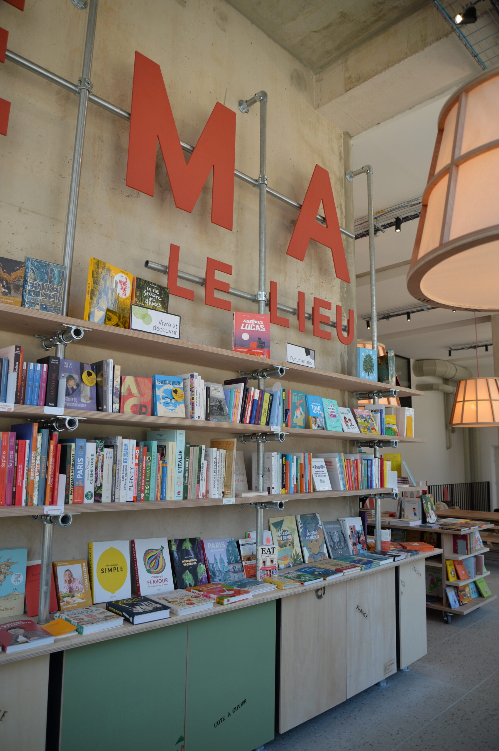 Le lieu se déploie autour de la bibliothèque monumentale. Fabriquée en métal et en bois de réemploi, sa structure légère soutient des étagères, où chaque livre trouve sa place. La chaleur du bois, les nuances naturelles et les traces du passé racontent une histoire à part entière.